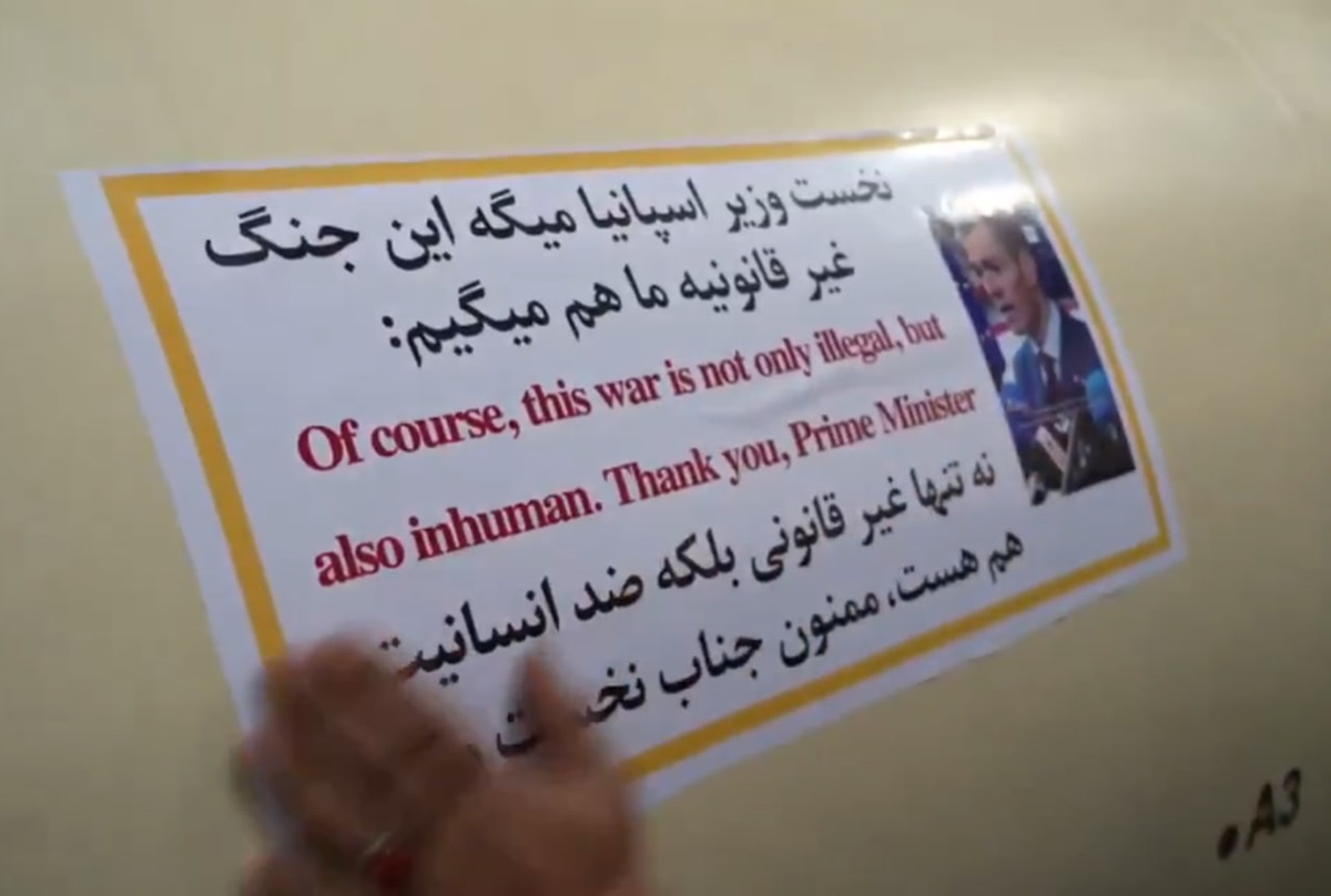 На наклейках також розміщений напис англійською та фарсі, що цитує антивоєнну промову Санчеса з недавнього саміту ЄС у Брюсселі: “Звичайно, ця війна не тільки незаконна, але й нелюдська”.