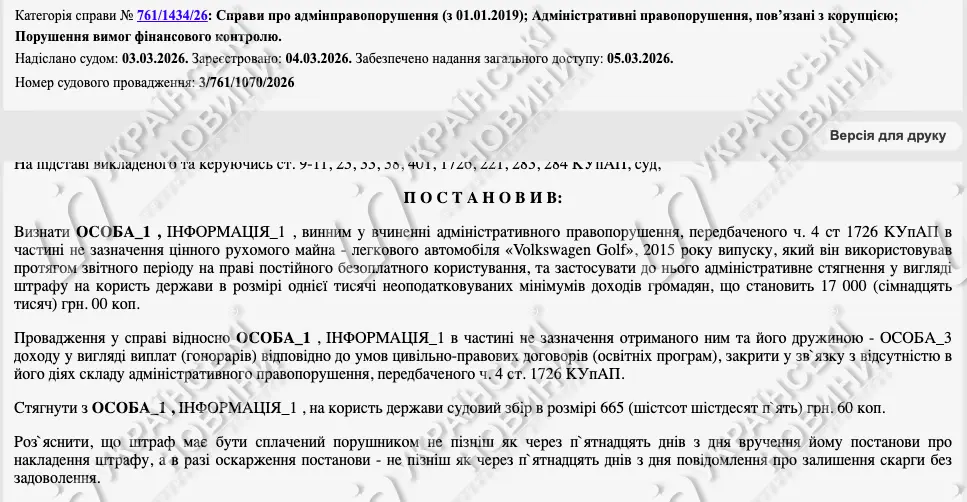 Суд встановив, що у декларації за 2023 рік Бугров не зазначив автомобіль Volkswagen Golf, яким користувався на праві безоплатного постійного користування, адже за документами автомобіль належить його сину.
