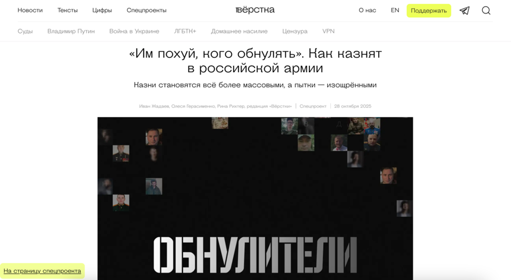 Стаття «Вёрстки» з промовистою назвою «Им пох**, кого обнулять» документує те, що самі солдати називають “внутрішньою м’ясорубкою”. Це система страху, побудована не на військовій дисципліні, а на тваринному інстинкті виживання.